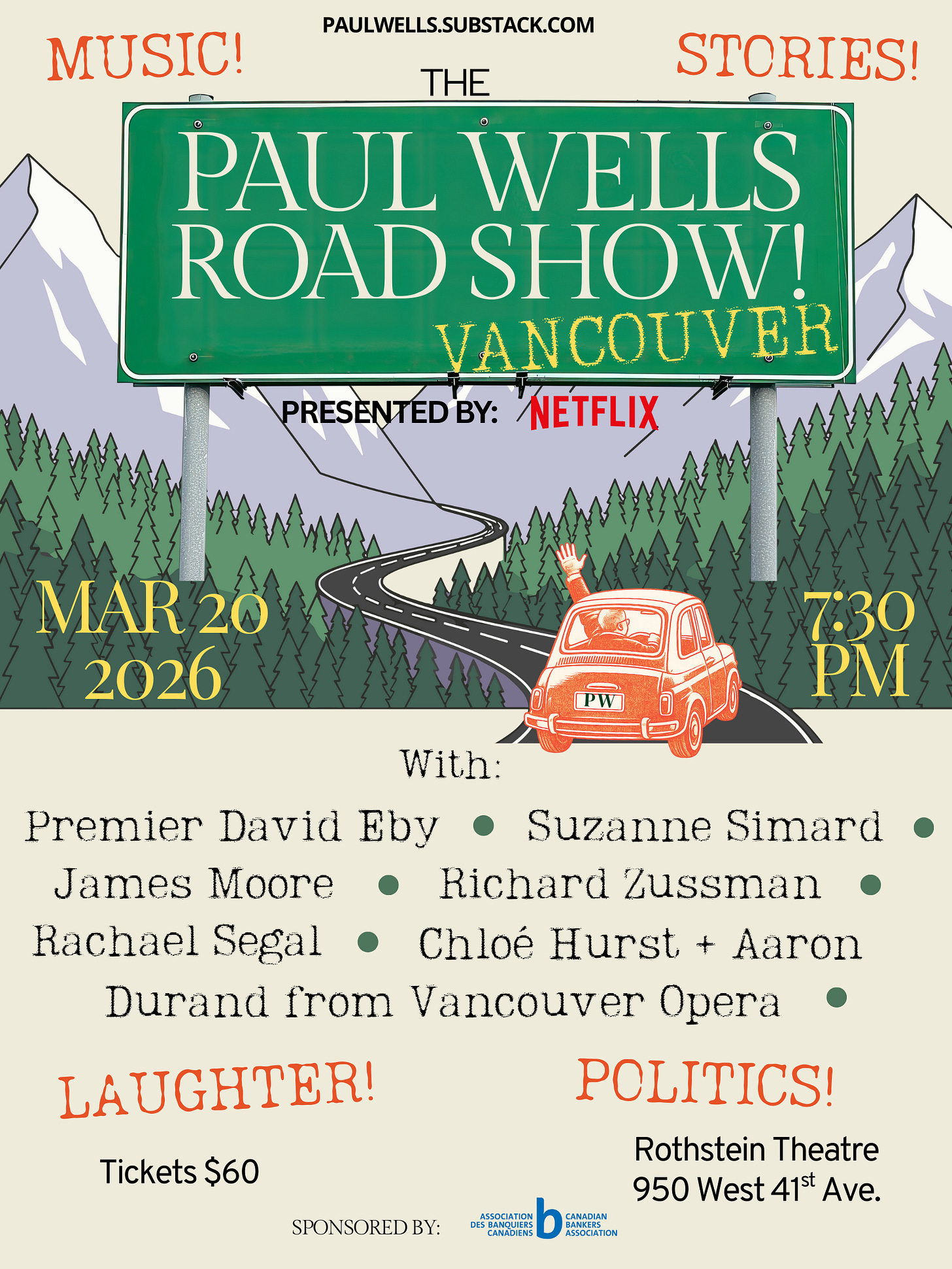 Today’s post is only a heads-up. Tickets for the Paul Wells Road Show: Vancouver will go on sale on Tuesday to the general public — but on Monday at 9 a.m. PST I’ll send pre-sale information to this Substack’s paying subscribers.