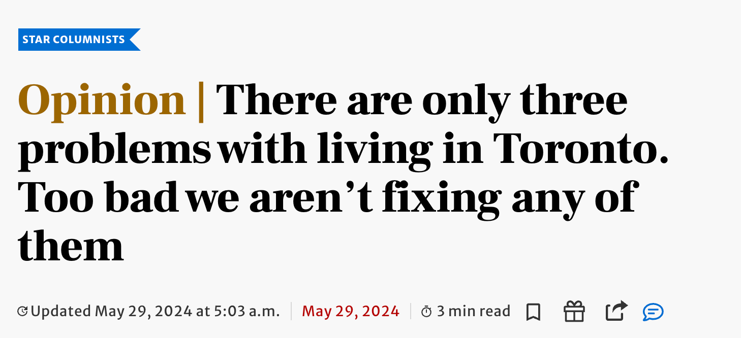 My relationship with Toronto is better than many Canadians’: I’ve never lived there, but I’ve often worked for Toronto-based organizations and I always look forward to visiting. But Toronto has become increasingly ungovernable, a place where it’s easier to find gridlock than a home, and where there’s no wholly satisfactory way to travel more than a dozen or so blocks in any direction.