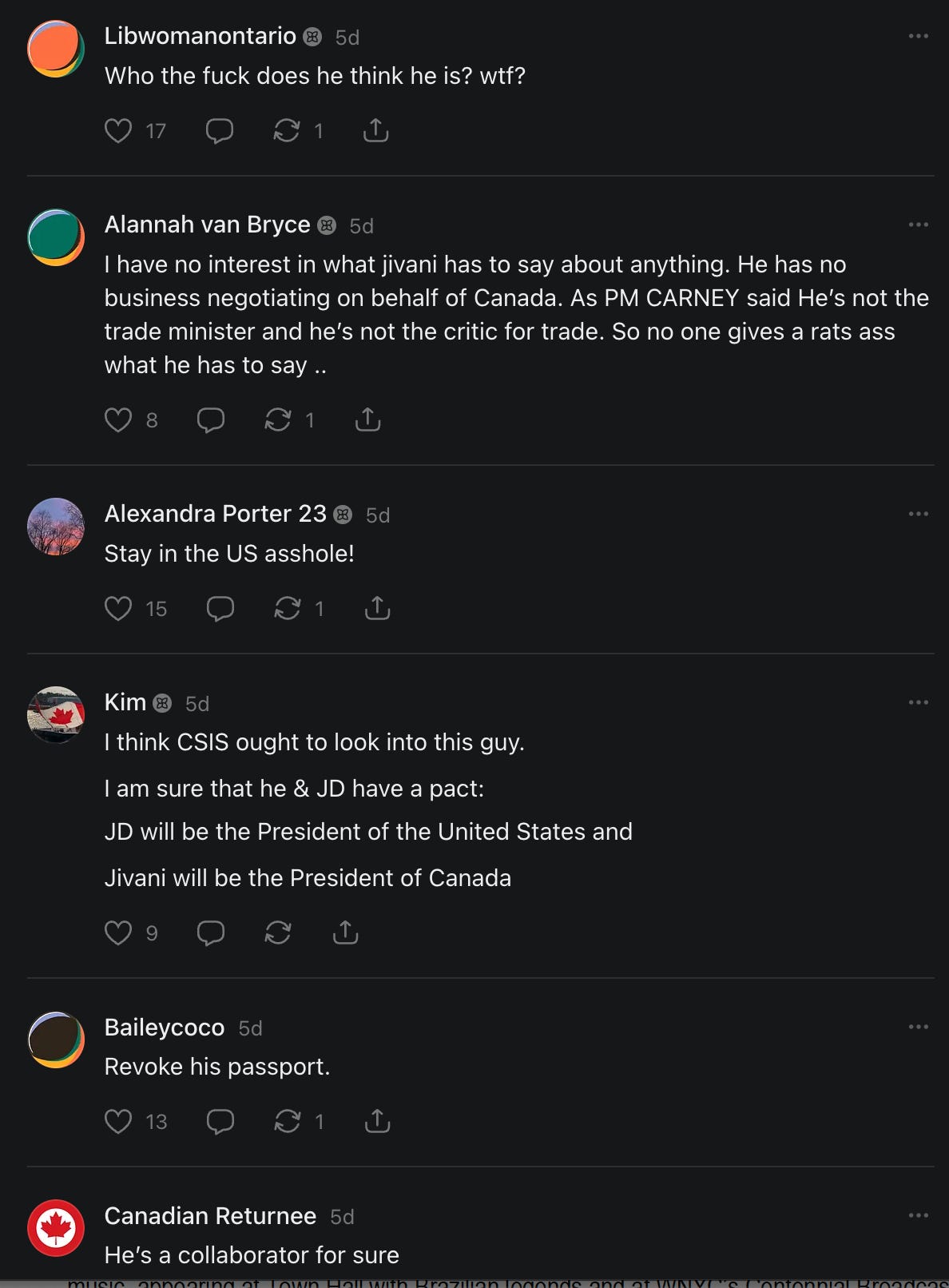 On Substack Notes, which is supposed to be the polite social network, somebody posted about Jivani saying Donald Trump told him he “loves” Canadians. Some of the responses: