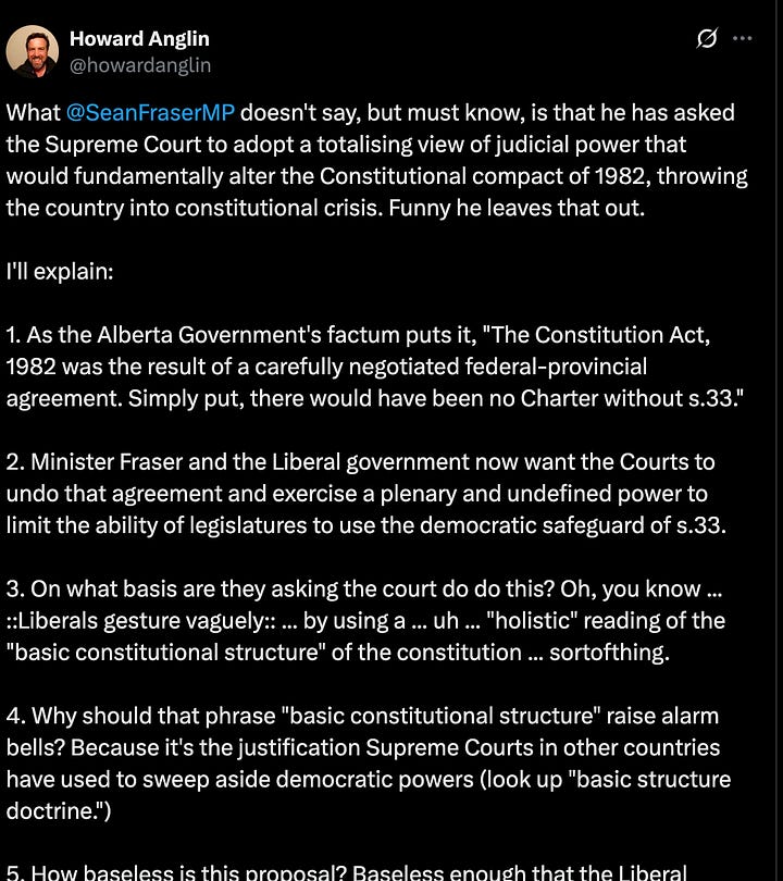 I’d stop there, but I’d be wrong to ignore serious observers arguing that AG Canada’s intervention isn’t anodyne or trivial, but that it’s such a radical attack on the balance of federalism that it would throw us all into constitutional crisis. Say hello to Ben Woodfinden, who interrupted his PhD studies to work for Conservative leader Pierre Poilievre, and to Howard Anglin, who was Deputy Chief of Staff to then-PM Stephen Harper and Principal Secretary to Alberta’s then-premier Jason Kenney. Here’s Ben’s tweet, and Howard’s, with partial screenshots so you get the gist: