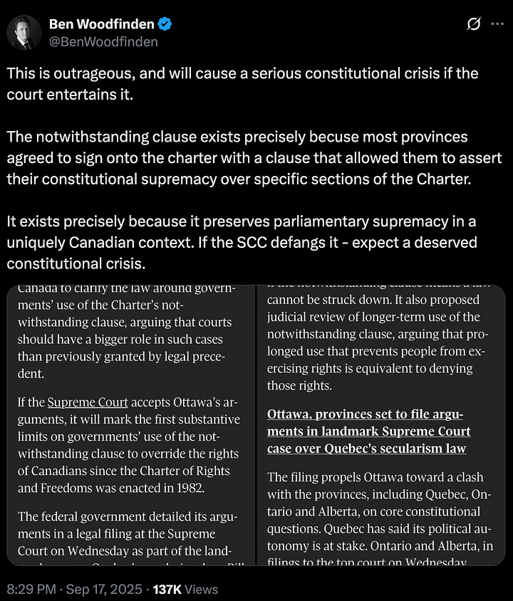 The notwithstanding clause is not an accident, it was a purposeful mechanism which ensures our elected leaders have the final say on legislation - NOT the judiciary.